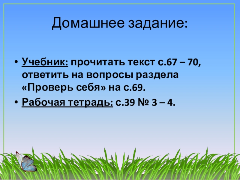 Учебник: прочитать текст с.67 – 70, ответить на вопросы раздела