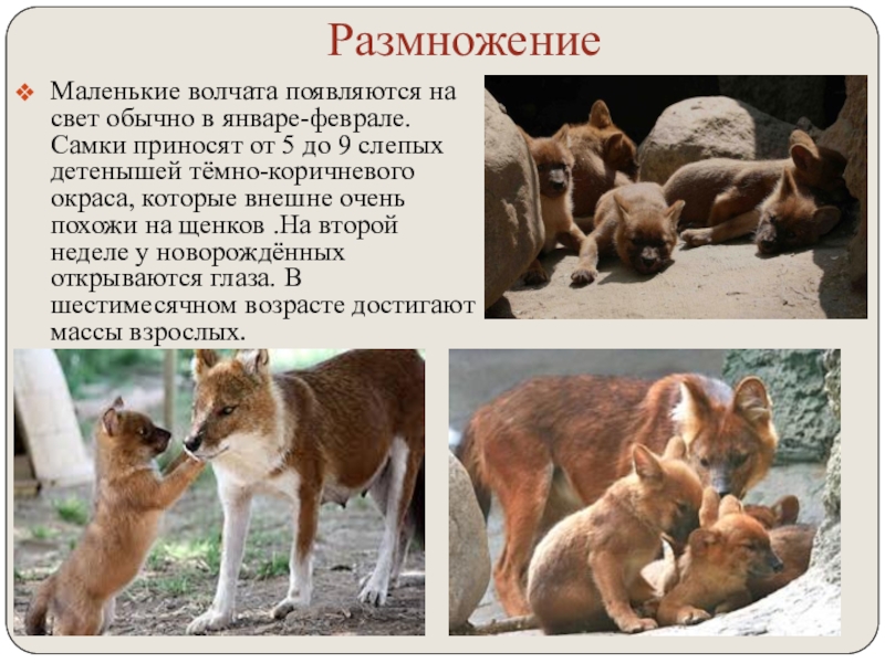 Размножение Маленькие волчата появляются на свет обычно в январе-феврале. Самки приносят от 5 до 9 слепых детенышей