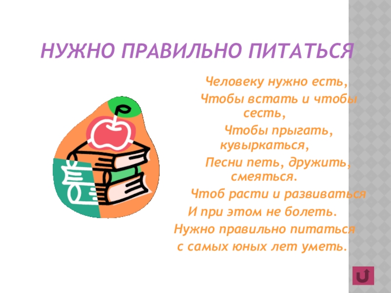 НУЖНО ПРАВИЛЬНО ПИТАТЬСЯ     Человеку нужно есть,     Чтобы встать и