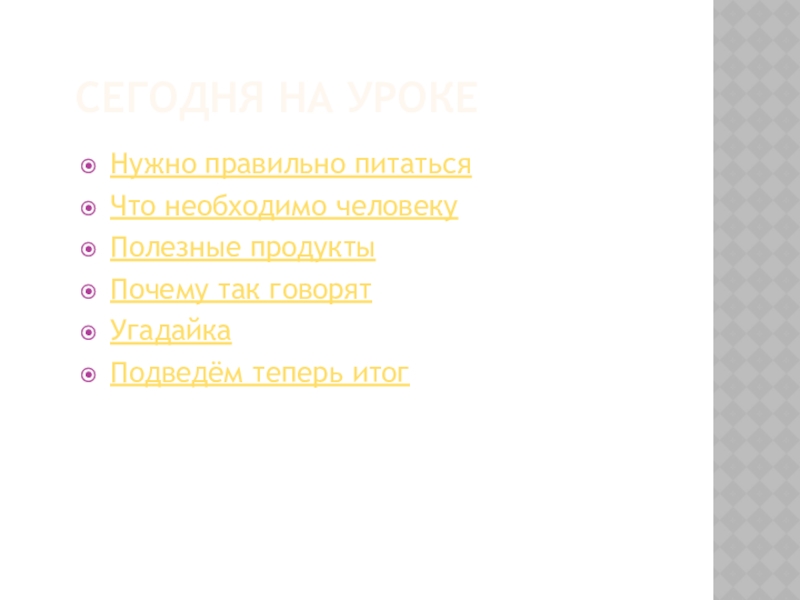 СЕГОДНЯ НА УРОКЕНужно правильно питатьсяЧто необходимо человекуПолезные продуктыПочему так говорятУгадайкаПодведём теперь итог