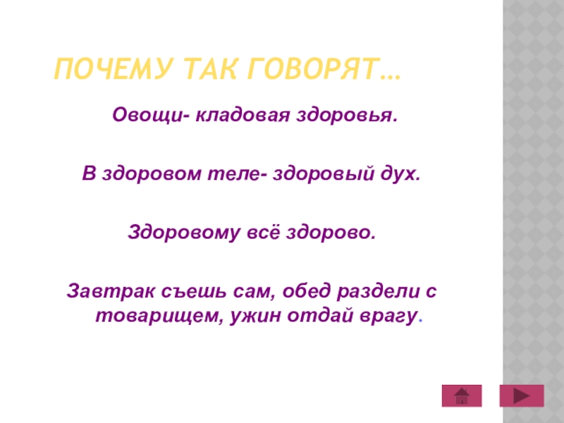 ПОЧЕМУ ТАК ГОВОРЯТ… Овощи- кладовая здоровья.В здоровом теле- здоровый дух.Здоровому всё здорово.Завтрак съешь сам, обед раздели с