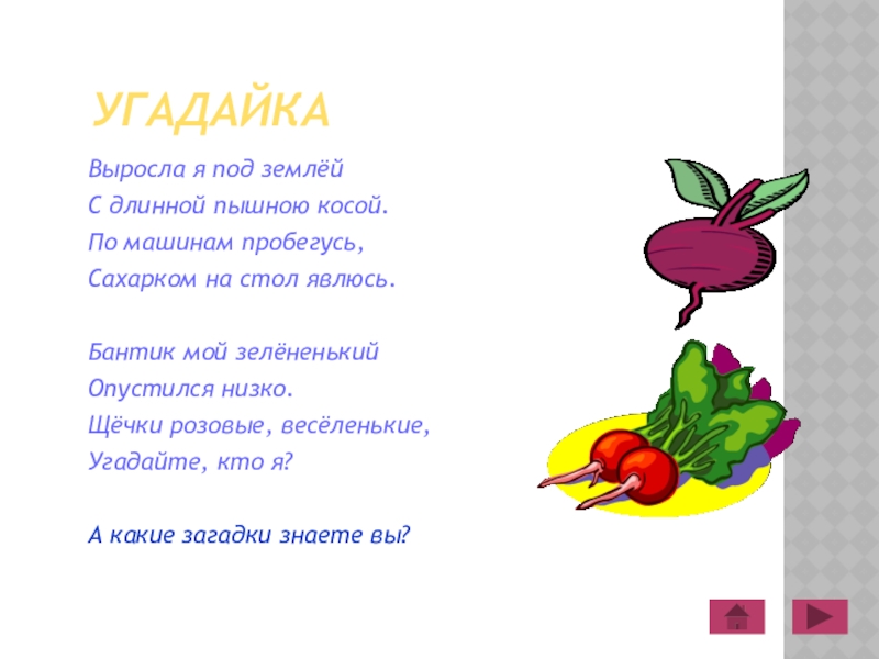УГАДАЙКАВыросла я под землёйС длинной пышною косой.По машинам пробегусь,Сахарком на стол явлюсь.Бантик мой зелёненькийОпустился низко.Щёчки розовые, весёленькие,Угадайте,