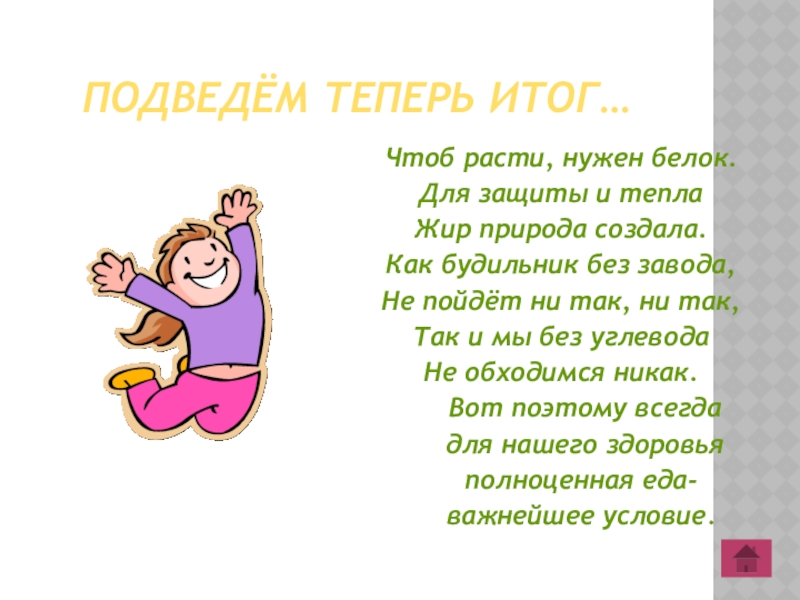 ПОДВЕДЁМ ТЕПЕРЬ ИТОГ…Чтоб расти, нужен белок.Для защиты и теплаЖир природа создала.Как будильник без завода,Не пойдёт ни так,