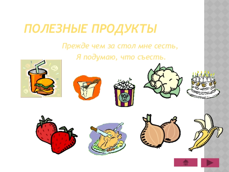ПОЛЕЗНЫЕ ПРОДУКТЫПрежде чем за стол мне сесть, Я подумаю, что съесть.