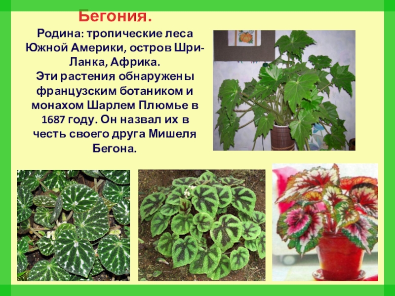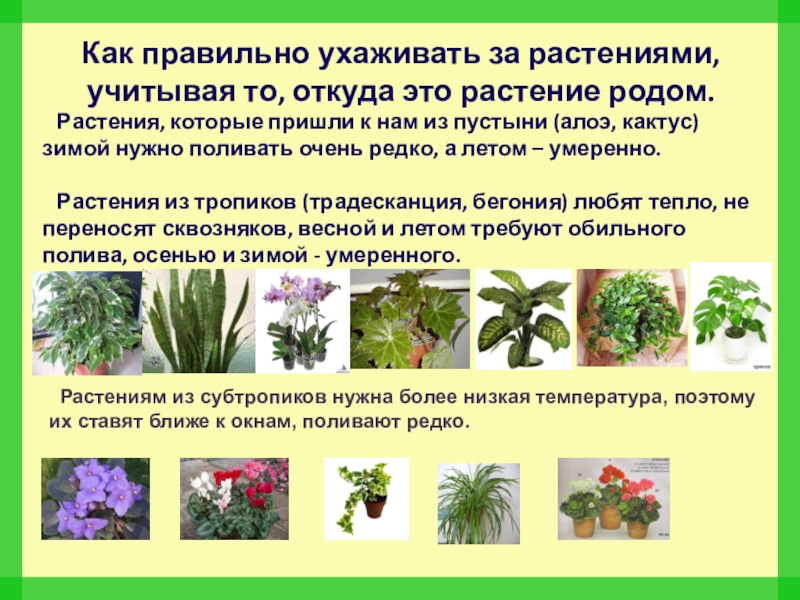 Растения из тропиков (традесканция, бегония) любят тепло, не переносят сквозняков, весной и летом требуют обильного полива, осенью и зимой - умеренного.