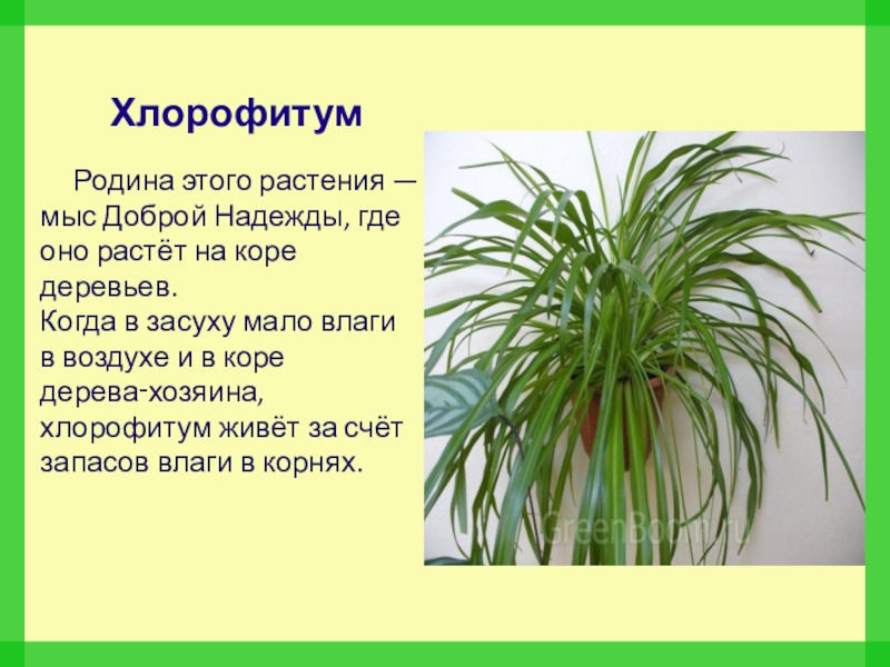 в воздухе и в коре дерева‑хозяина, хлорофитум живёт за счёт запасов влаги в корнях.