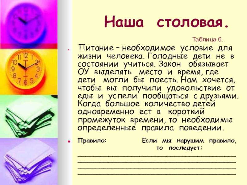 Питание – необходимое условие для жизни человека. Голодные дети не в состоянии учиться. Закон обязывает ОУ выделять место и время, где дети могли бы поесть. Нам хочется, чтобы вы получили удовольствие от еды и успели пообщаться с друзьями. Когда большое количество детей одновременно ест в короткий промежуток времени, то необходимы определенные правила поведении.