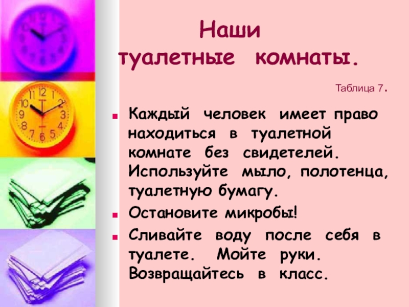 Сливайте воду после себя в туалете. Мойте руки. Возвращайтесь в класс.