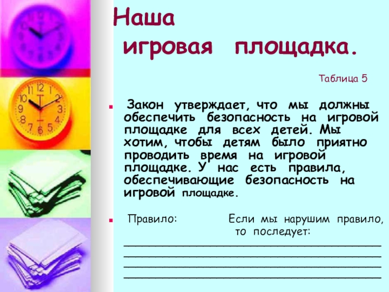 Закон утверждает, что мы должны обеспечить безопасность на игровой площадке для всех детей. Мы хотим, чтобы детям было приятно проводить время на игровой площадке. У нас есть правила, обеспечивающие безопасность на игровой площадке.