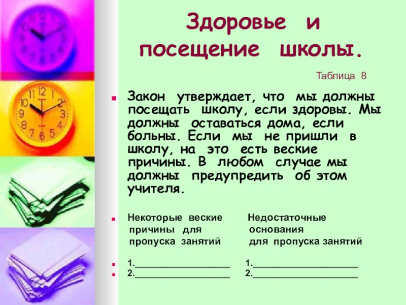 Закон утверждает, что мы должны посещать школу, если здоровы. Мы должны оставаться дома, если больны. Если мы не пришли в школу, на это есть веские причины. В любом случае мы должны предупредить об этом учителя.