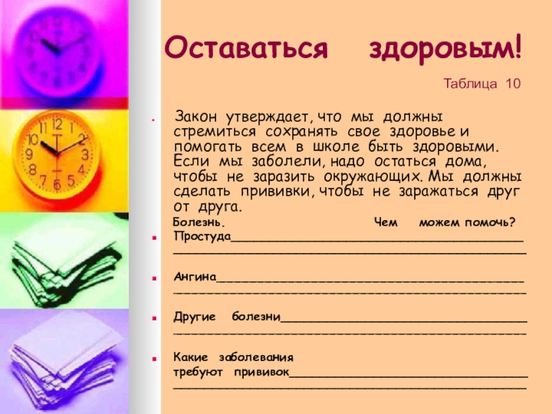 Закон утверждает, что мы должны стремиться сохранять свое здоровье и помогать всем в школе быть здоровыми. Если мы заболели, надо остаться дома, чтобы не заразить окружающих. Мы должны сделать прививки, чтобы не заражаться друг от друга.