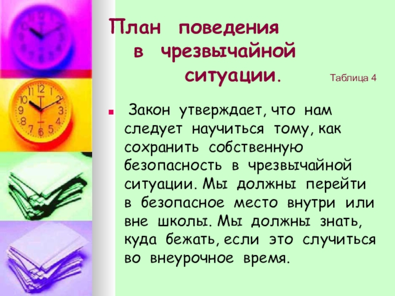 Закон утверждает, что нам следует научиться тому, как сохранить собственную безопасность в чрезвычайной ситуации. Мы должны перейти в безопасное место внутри или вне школы. Мы должны знать, куда бежать, если это случиться во внеурочное время.
