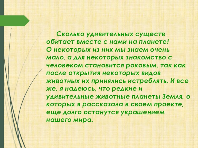 планете! О некоторых из них мы знаем очень мало, а для некоторых знакомство с человеком становится роковым, так как после открытия некоторых видов животных их принялись истреблять. И все же, я надеюсь, что редкие и удивительные животные планеты Земля, о которых я рассказала в своем проекте, еще долго останутся украшением нашего мира.