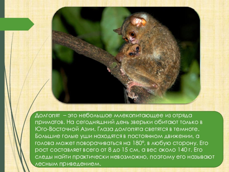 Слайд 8Долгопят – это небольшое млекопитающее из отряда приматов. На сегодняшний день