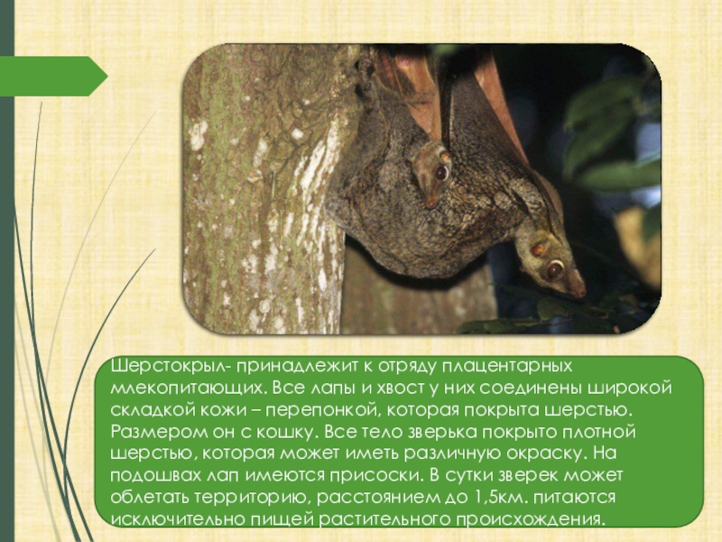 Слайд 9Шерстокрыл- принадлежит к отряду плацентарных млекопитающих. Все лапы и хвост у