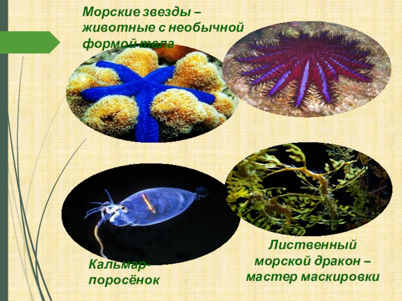 Морские звезды – животные с необычной формой телаКальмар-поросёнокЛиственный морской дракон –мастер маскировки