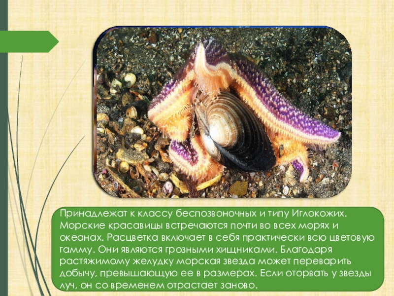 Слайд 5Принадлежат к классу беспозвоночных и типу Иглокожих. Морские красавицы встречаются почти