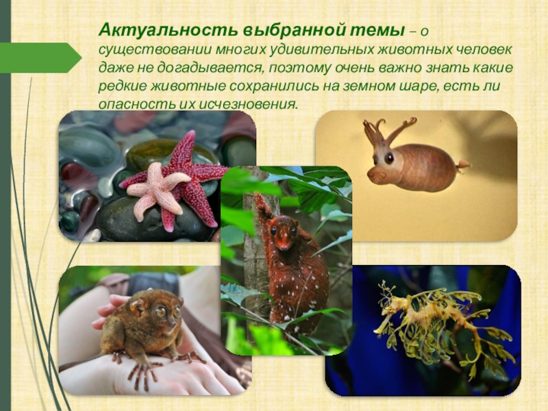 Актуальность выбранной темы – о существовании многих удивительных животных человек даже не догадывается, поэтому очень важно знать