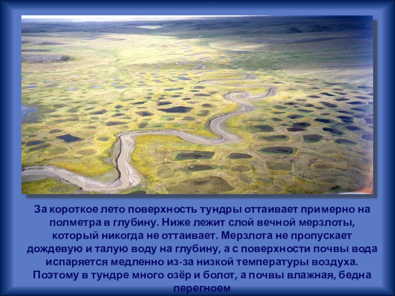 Слайд 6За короткое лето поверхность тундры оттаивает примерно на полметра в глубину.