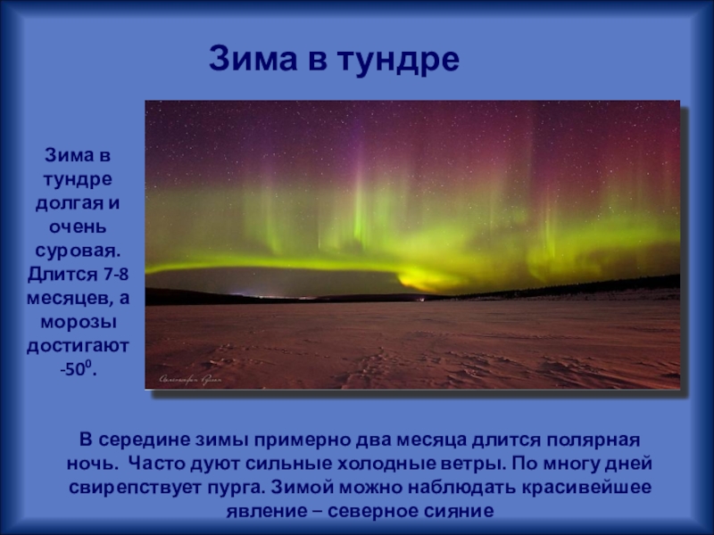 В середине зимы примерно два месяца длится полярная ночь. Часто дуют сильные холодные ветры. По многу дней свирепствует пурга. Зимой можно наблюдать красивейшее явление – северное сияние
