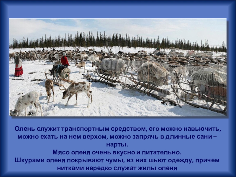 Слайд 22Олень служит транспортным средством, его можно навьючить, можно ехать на нем