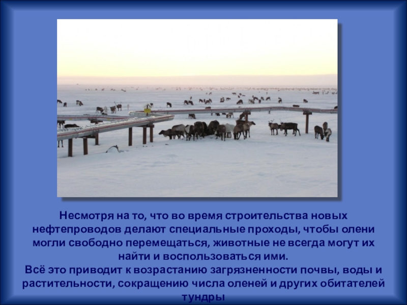 Всё это приводит к возрастанию загрязненности почвы, воды и растительности, сокращению числа оленей и других обитателей тундры