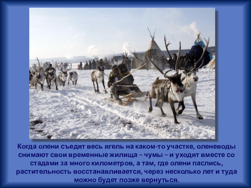 Слайд 21Когда олени съедят весь ягель на каком-то участке, оленеводы снимают свои