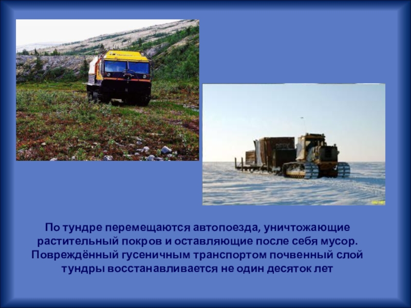 Слайд 26По тундре перемещаются автопоезда, уничтожающие растительный покров и оставляющие после себя мусор. Повреждённый