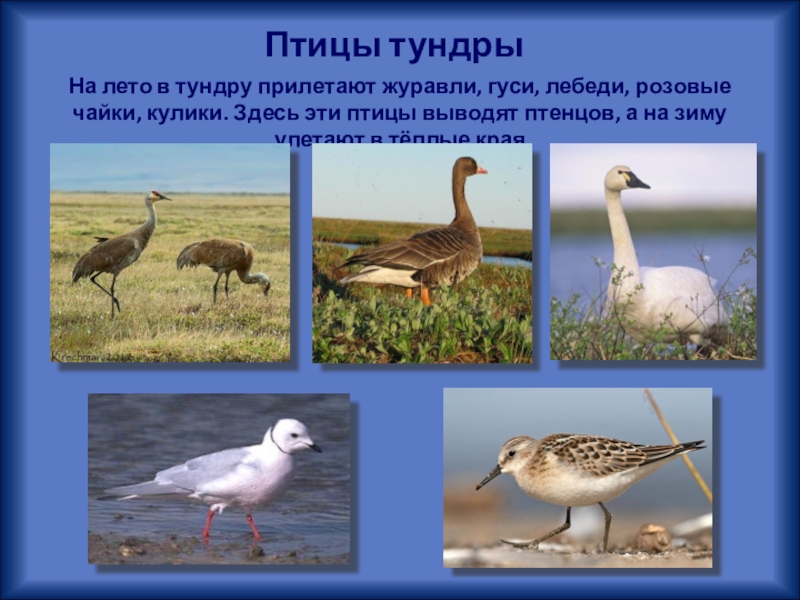 Слайд 13На лето в тундру прилетают журавли, гуси, лебеди, розовые чайки, кулики.