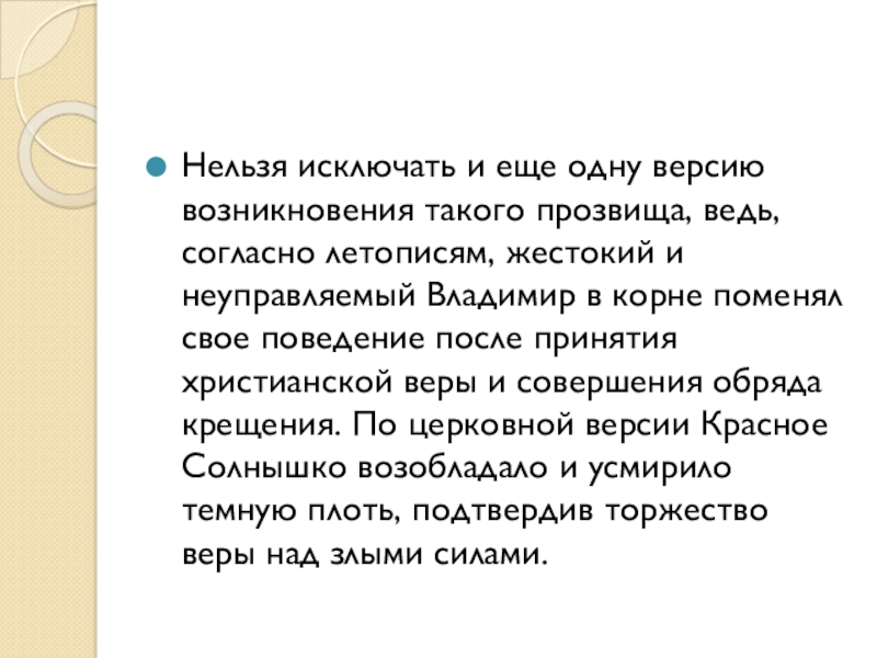 летописям, жестокий и неуправляемый Владимир в корне поменял свое поведение после принятия христианской веры и совершения обряда крещения. По церковной версии Красное Солнышко возобладало и усмирило темную плоть, подтвердив торжество веры над злыми силами.