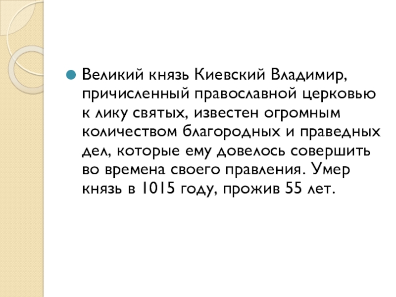 огромным количеством благородных и праведных дел, которые ему довелось совершить во времена своего правления. Умер князь в 1015 году, прожив 55 лет.