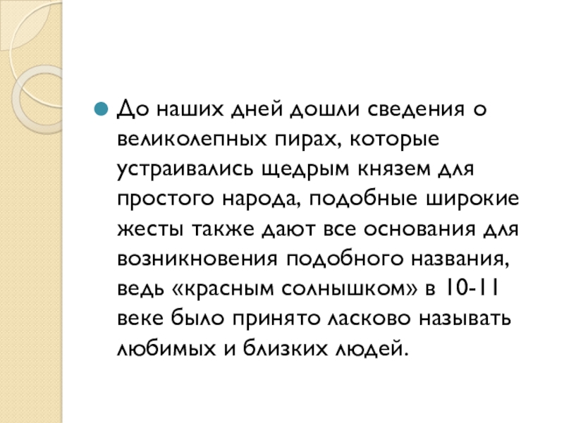 князем для простого народа, подобные широкие жесты также дают все основания для возникновения подобного названия, ведь «красным солнышком» в 10-11 веке было принято ласково называть любимых и близких людей.