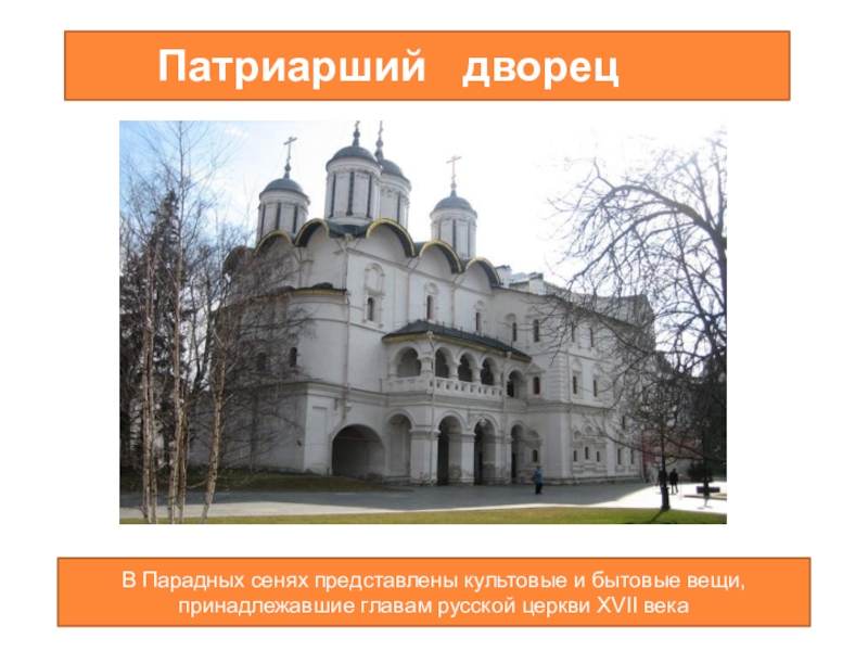 патриаршей ризнице драгоценные предметы, выполненные в кремлёвских мастерских, а также полученные в дар от посольств иностранных государств.