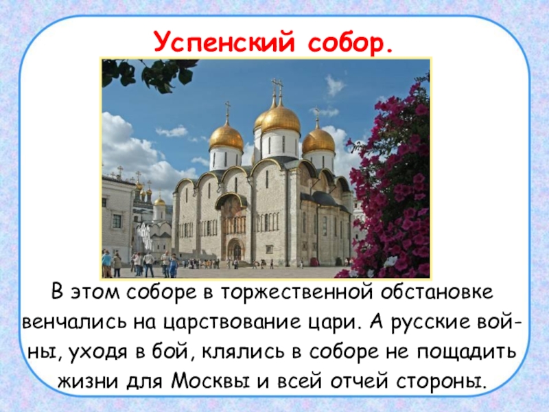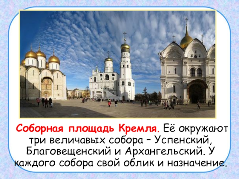 Слайд 20 Соборная площадь Кремля. Её окружают три величавых собора – Успенский, Благовещенский