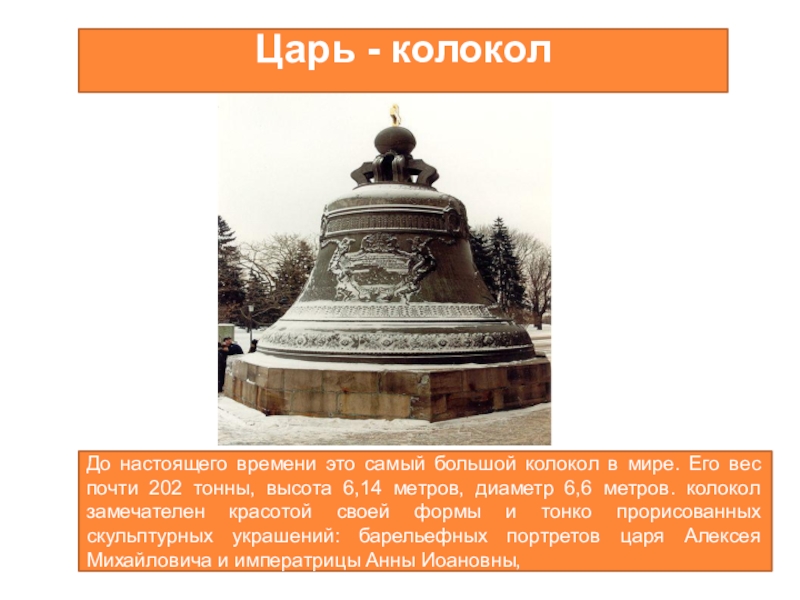 Его вес почти 202 тонны, высота 6,14 метров, диаметр 6,6 метров. колокол замечателен красотой своей формы и тонко прорисованных скульптурных украшений: барельефных портретов царя Алексея Михайловича и императрицы Анны Иоановны,