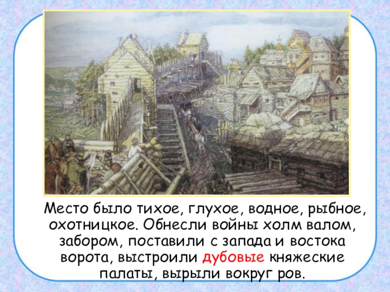 Слайд 10 Место было тихое, глухое, водное, рыбное, охотницкое. Обнесли войны холм валом,