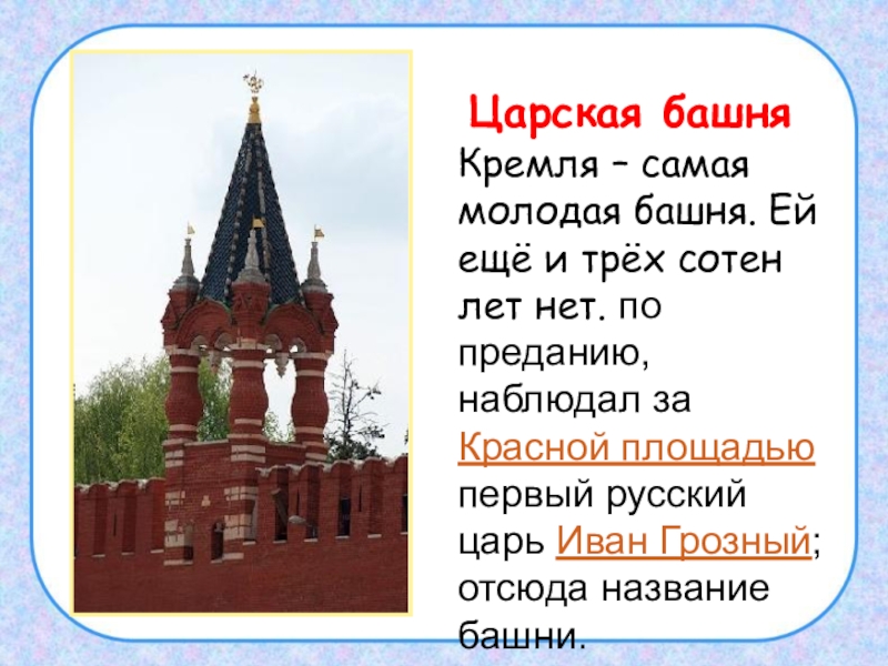 Слайд 17 Царская башня Кремля – самая молодая башня. Ей ещё и трёх
