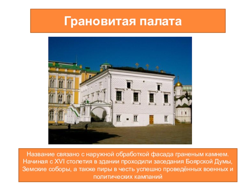 фасада граненым камнем. Начиная с XVI столетия в здании проходили заседания Боярской Думы, Земские соборы, а также пиры в честь успешно проведённых военных и политических кампаний