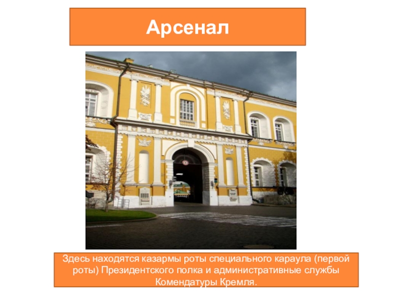 Здесь находятся казармы роты специального караула (первой роты) Президентского полка и