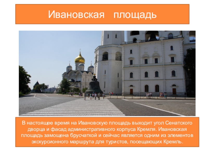 дворца и фасад административного корпуса Кремля. Ивановская площадь замощена брусчаткой и сейчас является одним из элементов экскурсионного маршрута для туристов, посещающих Кремль.