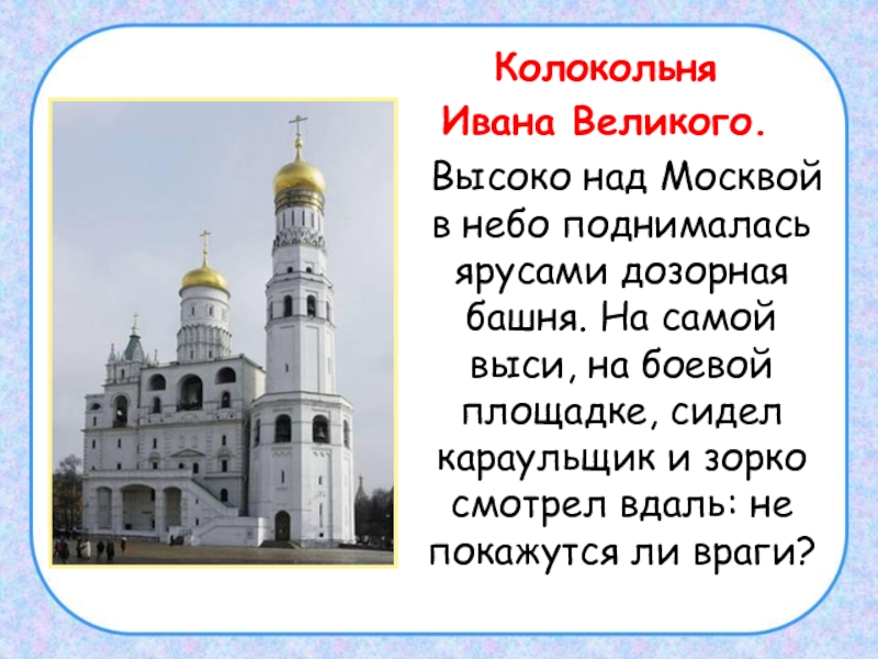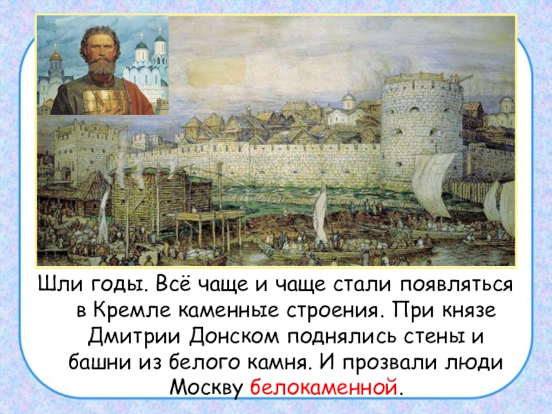строения. При князе Дмитрии Донском поднялись стены и башни из белого камня. И прозвали люди Москву белокаменной.