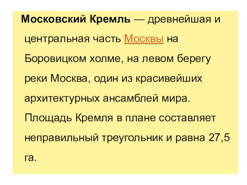 холме, на левом берегу реки Москва, один из красивейших архитектурных ансамблей мира. Площадь Кремля в плане составляет неправильный треугольник и равна 27,5 га.