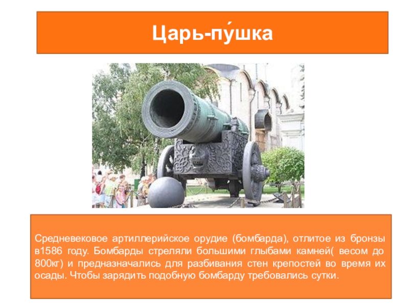 большими глыбами камней( весом до 800кг) и предназначались для разбивания стен крепостей во время их осады. Чтобы зарядить подобную бомбарду требовались сутки.