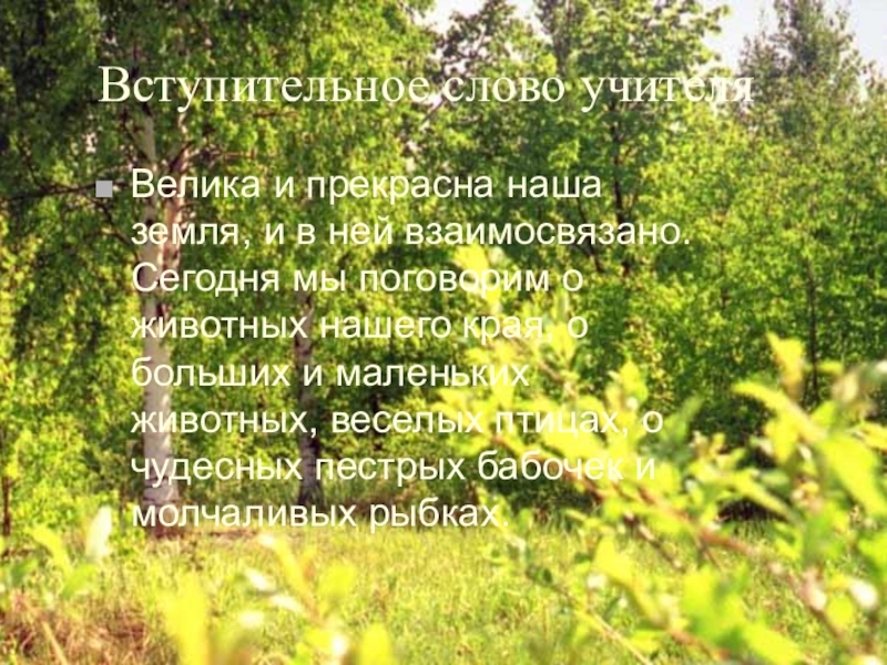 Вступительное слово учителяВелика и прекрасна наша земля, и в ней взаимосвязано. Сегодня мы поговорим о животных нашего