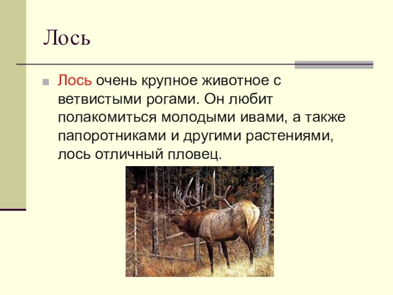 ЛосьЛось очень крупное животное с ветвистыми рогами. Он любит полакомиться молодыми ивами, а также папоротниками и другими