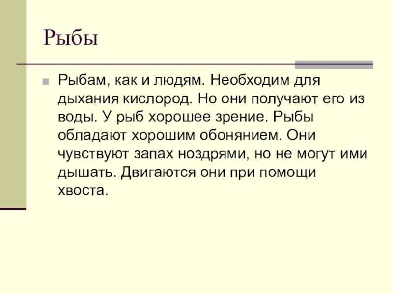 его из воды. У рыб хорошее зрение. Рыбы обладают хорошим обонянием. Они чувствуют запах ноздрями, но не могут ими дышать. Двигаются они при помощи хвоста.