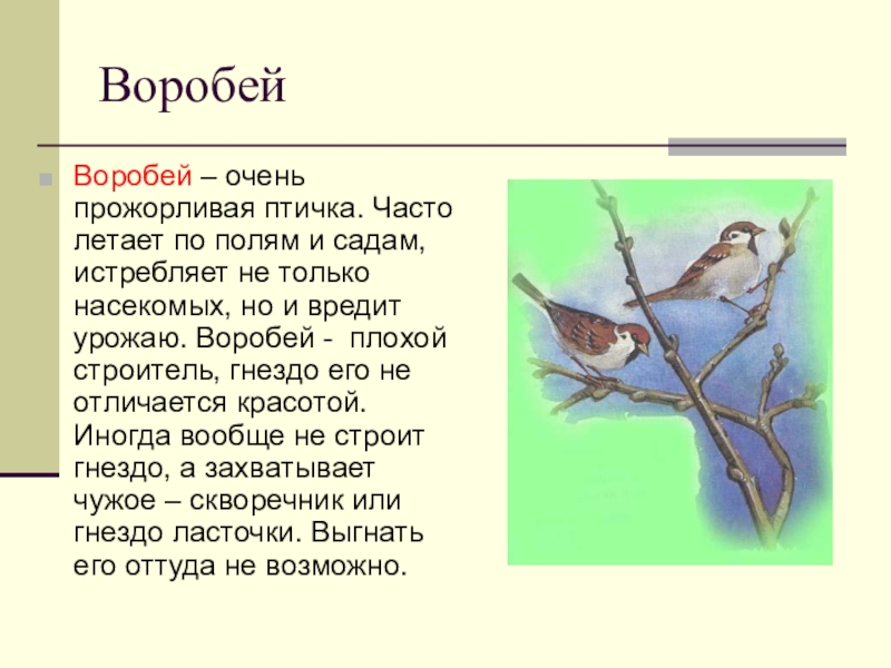 истребляет не только насекомых, но и вредит урожаю. Воробей - плохой строитель, гнездо его не отличается красотой. Иногда вообще не строит гнездо, а захватывает чужое – скворечник или гнездо ласточки. Выгнать его оттуда не возможно.