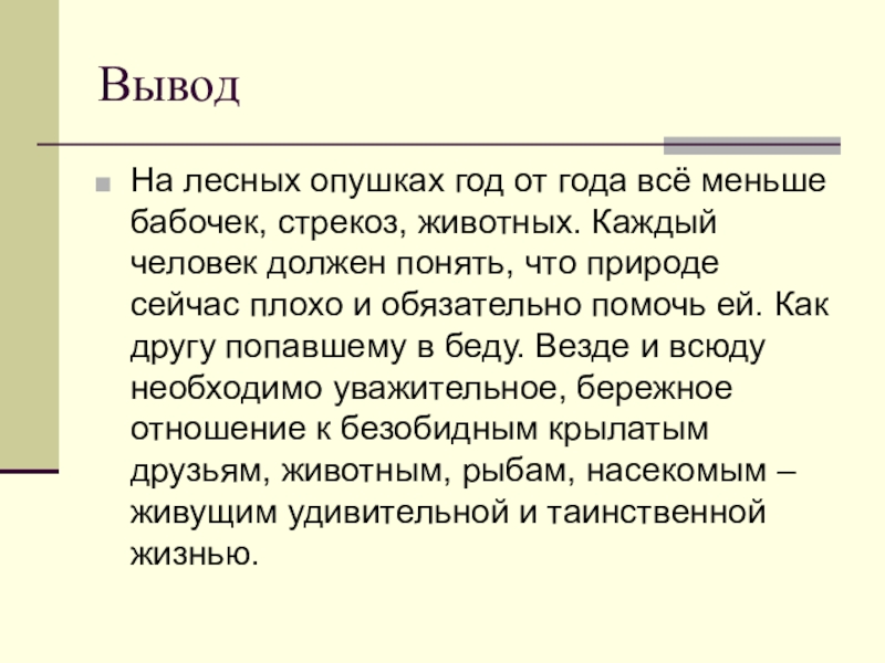 ВыводНа лесных опушках год от года всё меньше бабочек, стрекоз, животных. Каждый человек должен понять, что природе