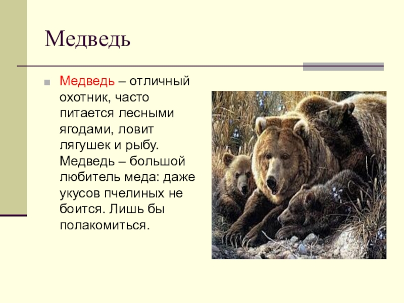 МедведьМедведь – отличный охотник, часто питается лесными ягодами, ловит лягушек и рыбу. Медведь – большой любитель меда: