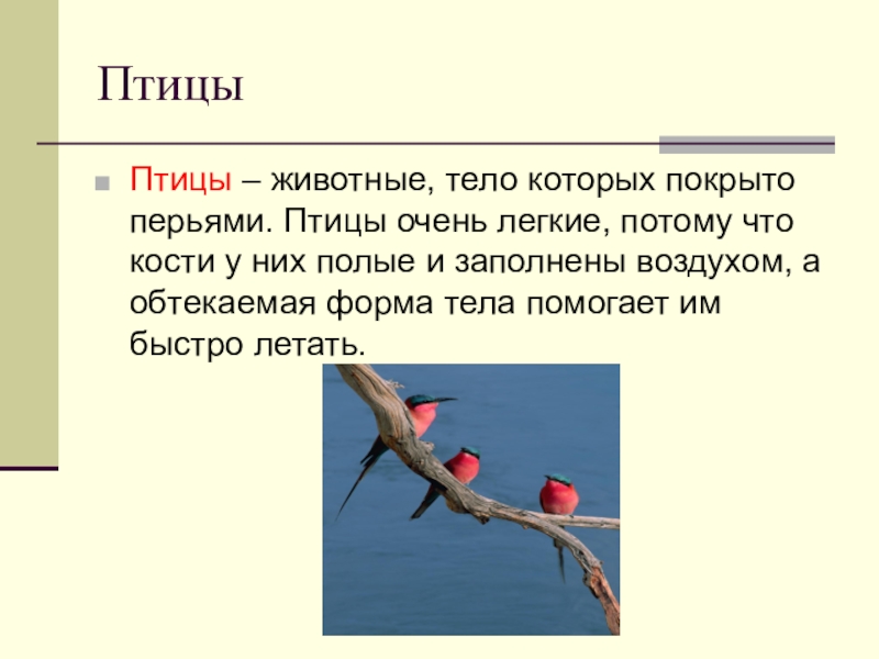 Птицы – животные, тело которых покрыто перьями. Птицы очень легкие, потому